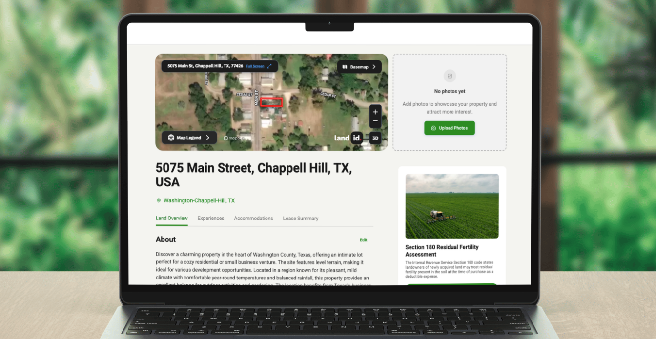 A digital land profile built from public records, maps, soil, and parcel data powered by LandID.