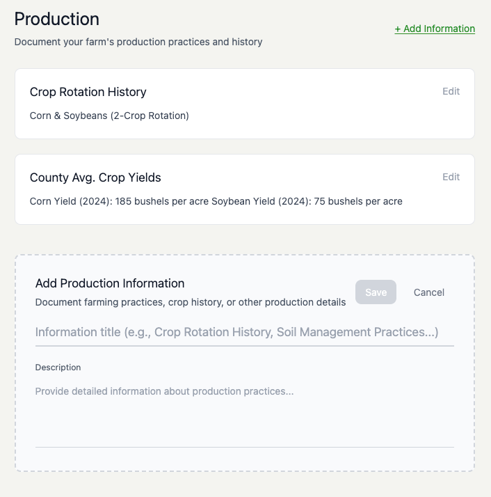 - Record your crop history and yields. You can manually input past production data and compare it to county averages.